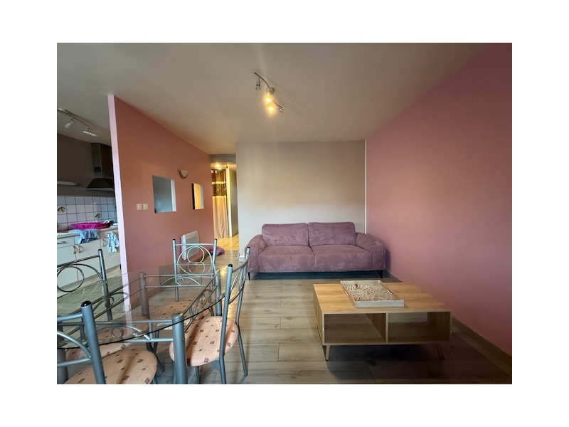 Entrée avec placard, cuisine semi-ouverte sur salon-séjour, salle de bains équipée, WC, 2 chambres.