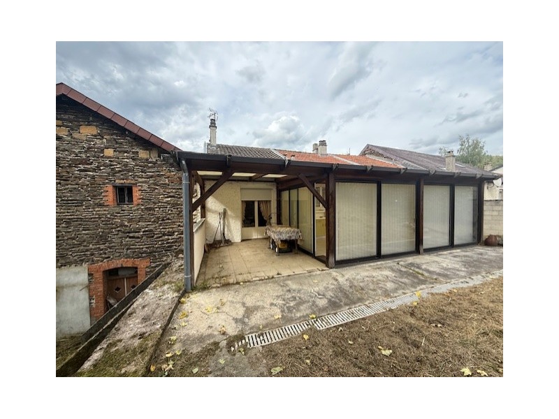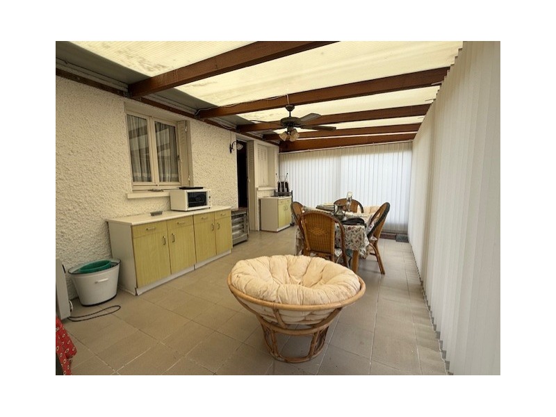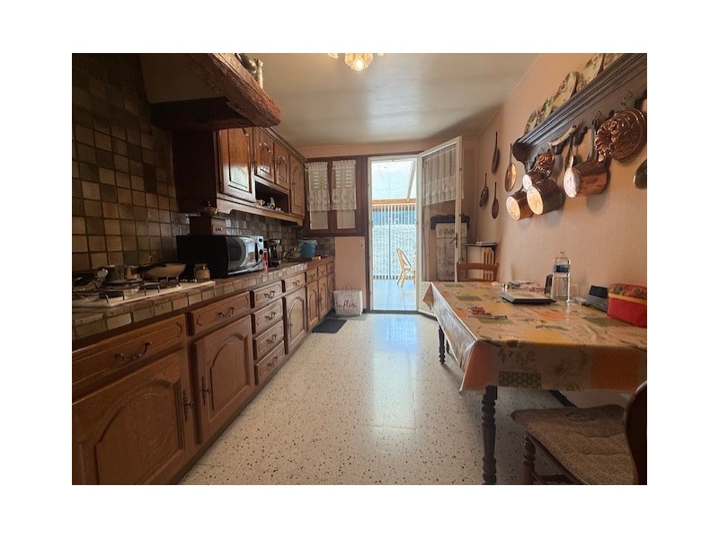 Au milieu : garage pour 1 ou 2 VL, maison S.H : 127 m² comprenant : entrée. Au 1er : palier desservant cuisine aménagée avec accès véranda non chauffée et jardin, salon-séjour avec cheminée, accès balcon, 3 chambres, salle de bains, WC.CC Gaz.