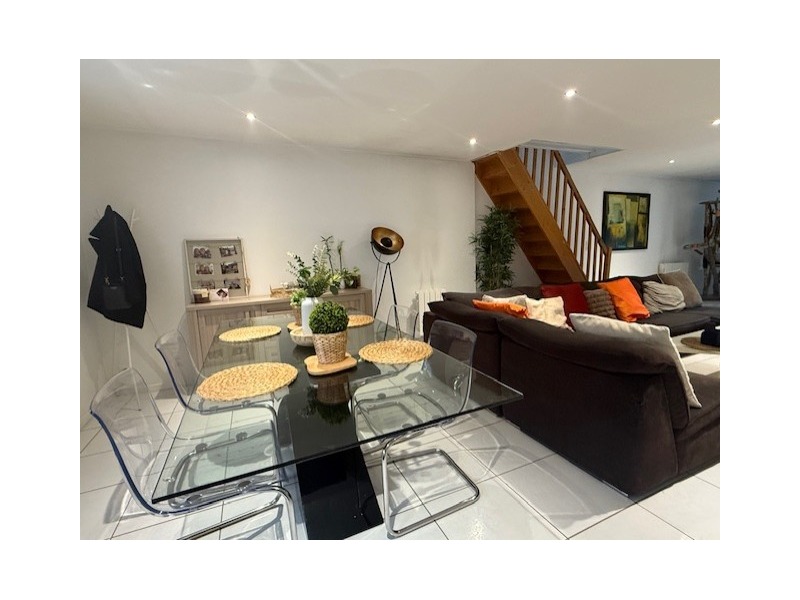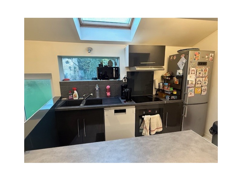 Une maison côté gauche louée, cuisine équipée ouverte sur salon-séjour.