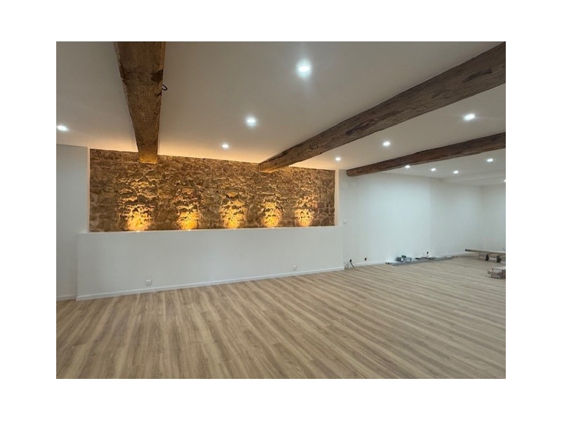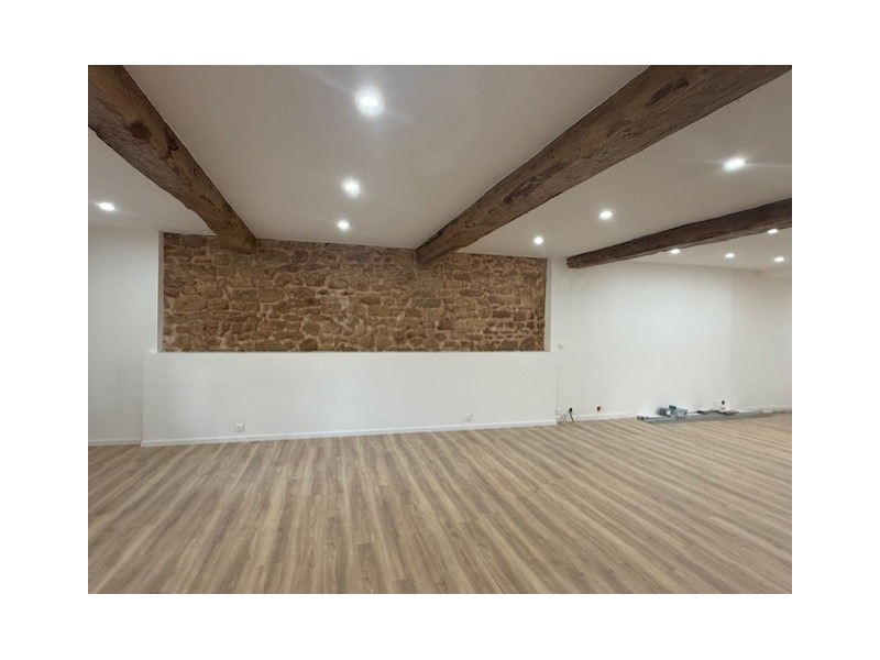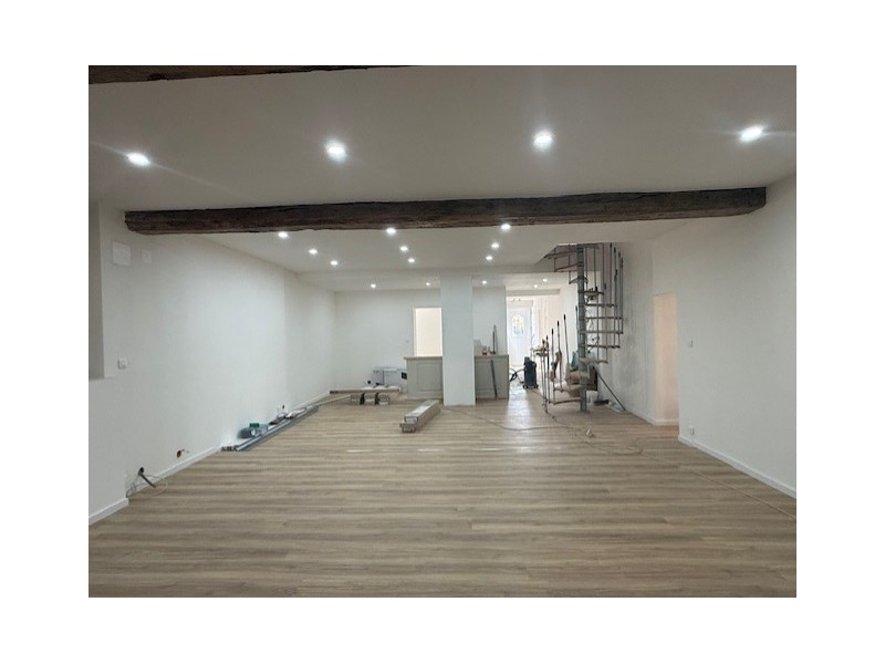 Hall d'entrée, cuisine à aménager de 56 m² avec accès jardin, vaste salon-séjour de 73 m², salle de douches équipée avec WC, 1 chambre avec coin buanderie.
