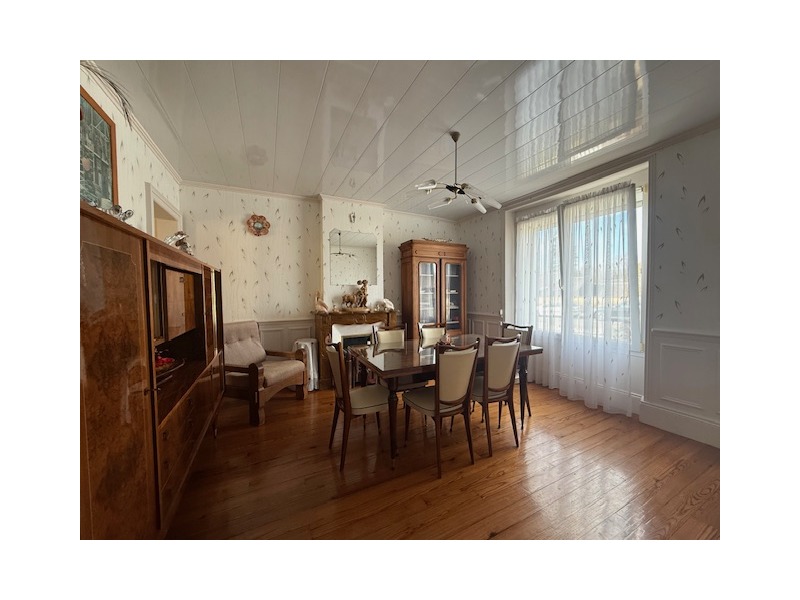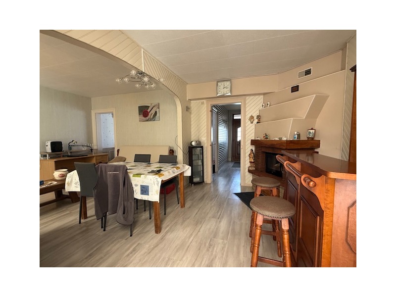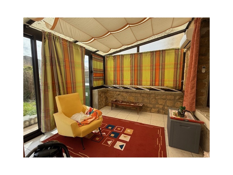 Entrée, séjour, grand salon avec cheminée (insert tubé) accès sur une véranda chauffée, WC broyeur + salle de douches dans la véranda, cuisine aménagée, 1 bureau.
